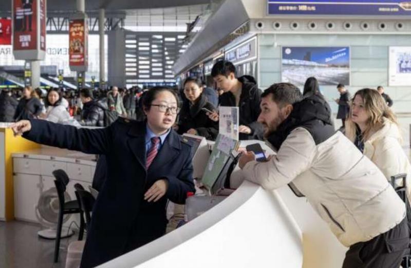 r为更好地服务外籍旅客,春运前夕,成都东站首个“外籍旅客服务站”正式设立,5名经过培训的铁路工作人员正式入岗,专门为外籍旅客答疑解惑,更加高效便捷地为他们办理购票、改签、乘车等综合业务。